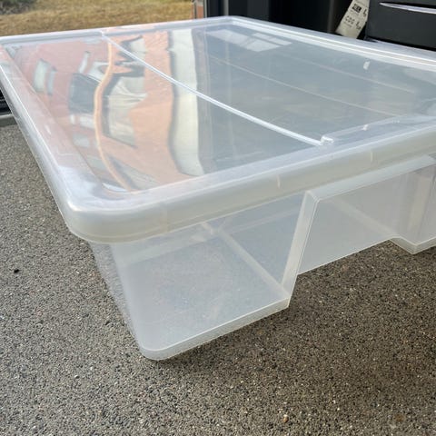 IKEA säilytyslaatikko kannella. Materiaalina vaalea läpikuultava muovi. Soveltuu esim sängyn alle. Koko 55,5x18x92cm