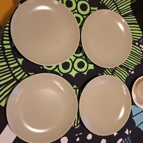 Lautasissa veitsistä tulleita harmaita jälkiä, mutta muuten ihan siistit.