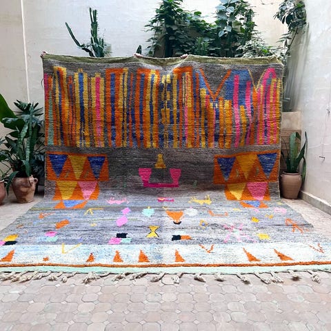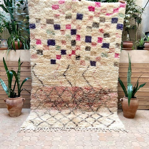 Ihastuttava marokkolainen käsinsolmittu matto. Matto on käyttämätön ja juuri pesty valmistuksen jälkeen. Tämän kun kerran lattialle asettaa, on siitä vaikea luopua. Boujaad on perinteinen berberien matonkutomisalue Marokossa. Perinteisten kuvioiden lisäksi sieltä tulee tänäpäivänä upeita moderneja mattoja, jotka ovat ainutlaatuisia värienkäytön ja käsityön taidonnäytteitä.