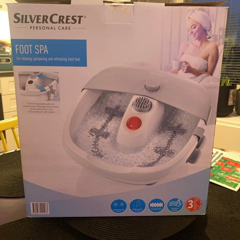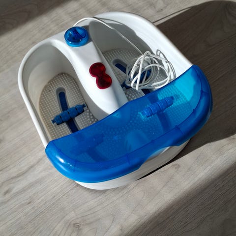 Hugin merkkinen foot spa jalkakylpylaite. Jäänyt komeroon ”varalle” eli käyttämätön. Juuri puhdistettu myyntiä varten. Suojalippa hieman rikkoutunut säilytyksessä.