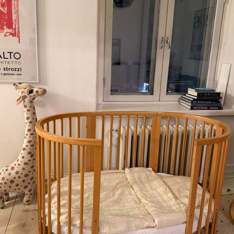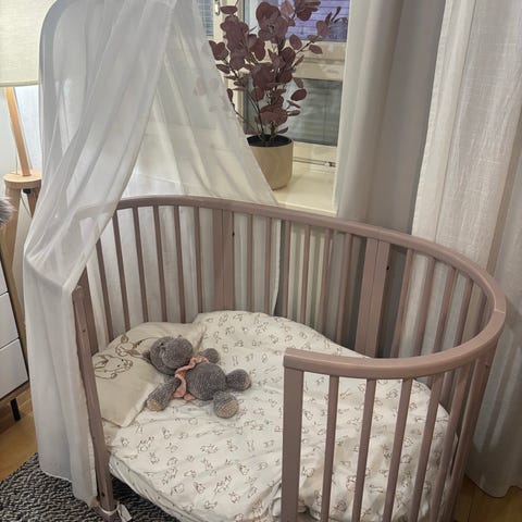 Stokke pinnasänky valkoinen. Mini ja Junior -palat. Uudintanko ja -verho. Sisältää patjat ja lakanat.
