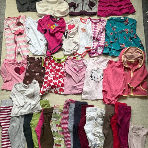Myyn kuvassa olevan, tytön käytössä olleen vaatepaketin 68-74 cm.