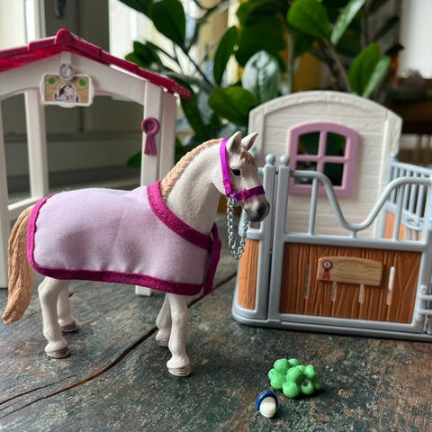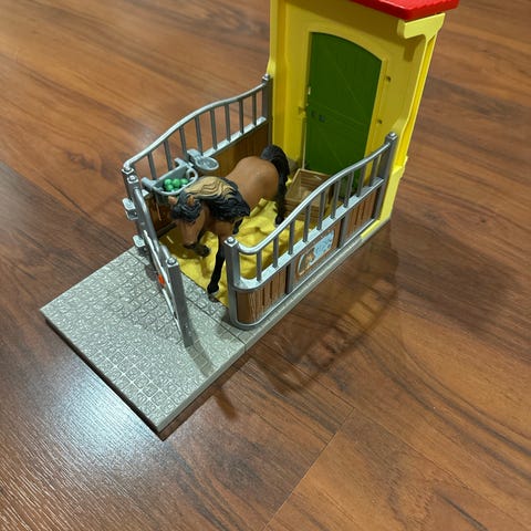 Schleich hevostalli. Sisältää kuvassa näkyvät osat. Hyväkuntoinen ja ehjä.