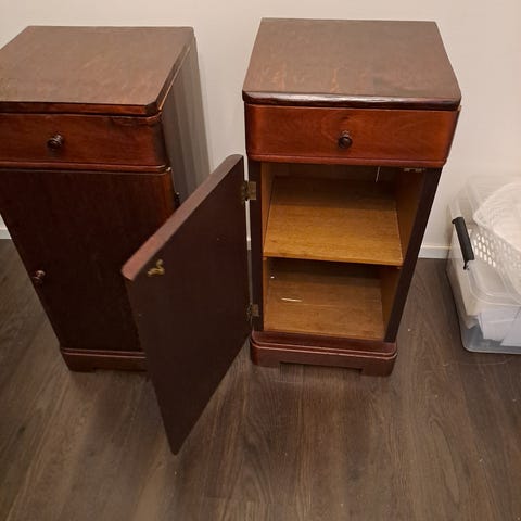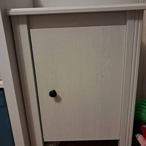 Siisti yö pöytä koivua, kuultovalkoinen maali päällä. Pieni kaappi jonka sisään mahtuu hyvin tavaroita.