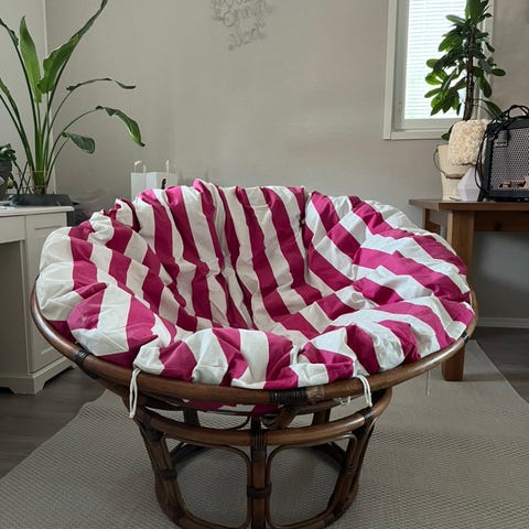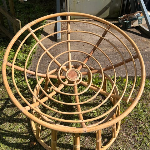 Rottinkinen pesätuoli 2 kpl. Olleet ainoastaan sisätiloissa olemattomalla käytöllä. Jonkinverran pesän koristekierteiden irtoamista kuten kuvassa näkyy, ei vaikuta mitenkään tukevuuteen. Toisessa pehmustetyyny. Kuljetus onnistuu Huittinen-Tampere-akselilla.