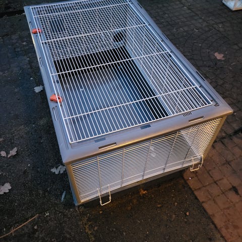 jyrsijälle tavaraa. kaikki kerralla. Kantokoppa, heinäkaukalo, mäntypuusta tehty piilo johon lisätty toinen oviaukko, sekä heinä/herkku''kehikko''. Kantokopan kannessa on halkeama, mutta liimalla se on korjattavissa. ei haittaa myöskään käyttöä
