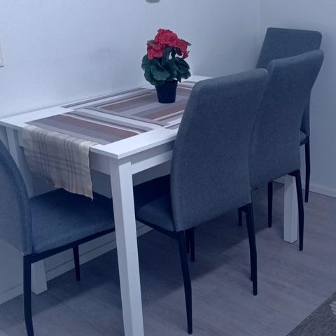 Valkoinen pöytä ja 4 mustaa tuolia