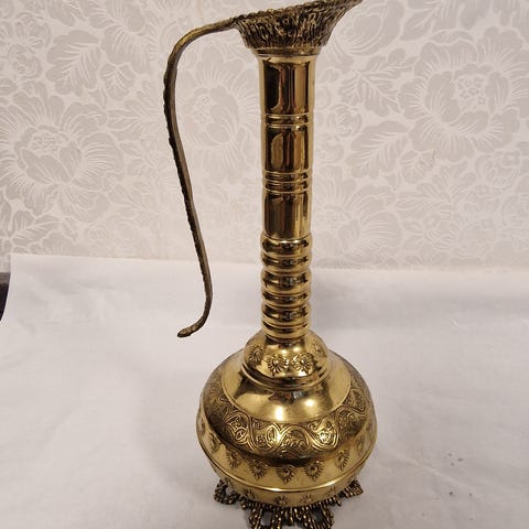 Koristeellinen jalallinen maljakko sisäkäyttöön. Maljakko-osa on pyöreä ja syvä, ja se soveltuu esimerkiksi koriste-esineiden tai kasvien esillepanoon. Kokonaisuus on harmaa ja kullansävyinen, ja siinä on kohokuvioituja koriste-elementtejä. Jalusta on pylväsmäinen ja monikulmainen, mikä tekee rakenteesta tukevan. Materiaali vaikuttaa olevan kovaa, maalattua massaa tai vastaavaa. Sopii käytettäväksi sisustuselementtinä lattialle sijoitettavana jalallisena maljakkona tai tasona koriste-esineille.Korkeus 83 ruukun jalkaisia 28