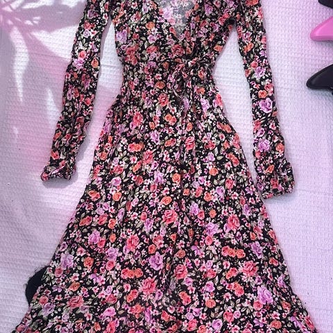 Amisu naisten kesämekko, koko 40. Mekko on valmistettu 100 % viskoosista ja siinä on kirjava, pääosin punasävyinen kukkakuosi. Mallissa on lyhyet hihat ja V-pääntie. Materiaali on kevyttä ja laskeutuvaa, sopii käytettäväksi kesämekkona arkeen tai vapaa-aikaan. Joustava vyötärö, pituus n. 80cm