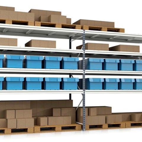 Noin 275 cm leveä, 40 cm syvä varastohylly, jossa siniset avomalliset päätytikkaat ovat 208 cm korkeita. Jokaisessa välissä voi olla esim 5 hyllytasoa tai haluttu määrä hyllylevyjä.