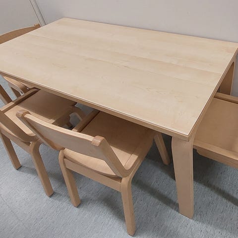 Pöydän mitat; pitkä sivu leveys 108cm, lyhyt sivu leveys 63cm, syvyys 60cm ja korkeus 61cm. Vahvaa puuta.