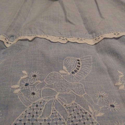 Valkoisesta 100% puuvillakankaasta ommeltu kokoessu, jossa niskalenkki ja vyötärönauhat.