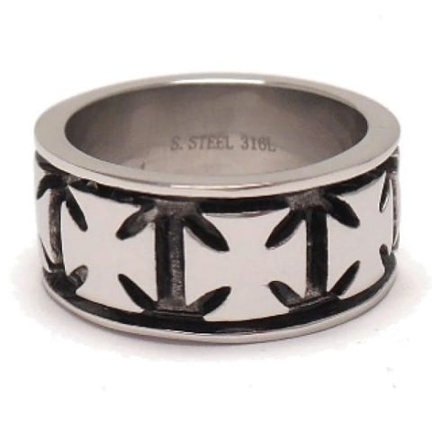 Hieno rautaristisormus, jonka pinta on ensin patinoitu mustaksi ja sitten harjattu, mikä antaa sormukselle upean mustan ja teräksen välillä vaihtelevan värityksen.
