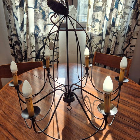 Takorautainen kynttiläkruunu, pöytäkynttilöille. Terassikatoksen rustiikkinen kaunistaja.
