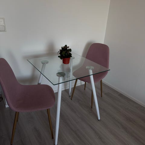 Pöydässä on käytön jälkiä hieman ne näkyy kuvassa aika hyvin! Tuolit siistissä kunnossa. Jos ei halua ostaa koko settiä niin laita viestiä voidaan sopia tuolista ja pöydästä hintoja erikseen😇 pöytä on ikean ja tuoleija ei muisteta.
