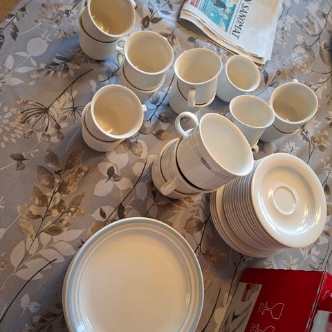 Uudenveroinen astiasto. Kuvista näkyy kpl-määrät, vetoisuudet ja koot.