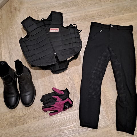 Koko setti kerralla pois. Kengät 41, kypärä 54-56, chapsit, raippa ja suojaliivi.