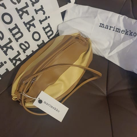 Marimekko karla lila violetti isompi olkalaukku. Laukku on pehmeää nahkaa. Laukussa on vetoketjusuljenta ja tasku sisällä. Käytetty joitakin kertoja, käytön jälkiä kulmassa (näkyy kuvassa), muuten ehjä ja siisti.