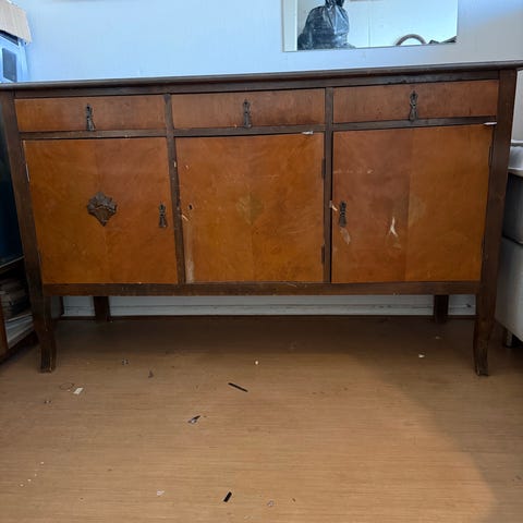 Annetaan ruskeaksi petsattu senkki, jossa kaksi kaappia ja neljä laatikkoa.