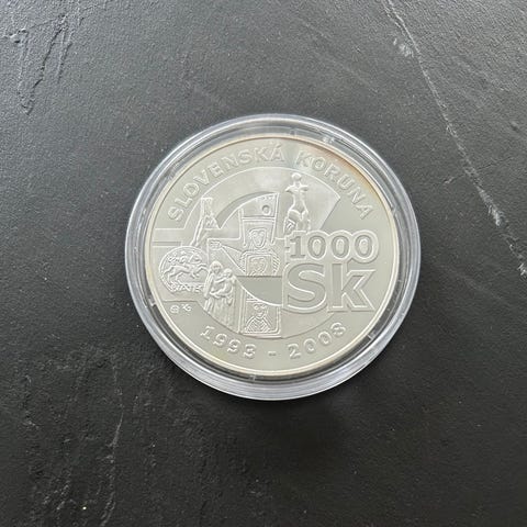 Hopeinen muistokolikko muovikotelossa