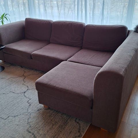 Siisti kulmasohva kahdella tyynyllä ja yhdellä niskatyynyllä. Hyvässä kunnossa muuten mutta osassa kohtaa hieman kulumaa istumisesta.