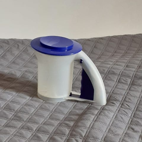 Tupperware silppuri. Punainen, läpikuultava muovirunko ja valkoisilla yksityiskohdilla varustettu kansi. Sisällä mekaaninen teräosa ruoan pilkkomiseen ja silppuamiseen käsin vedettävällä mekanismilla. Soveltuu esimerkiksi vihannesten, yrttien tai pienten raaka-aine-erien hienontamiseen keittiökäytössä.