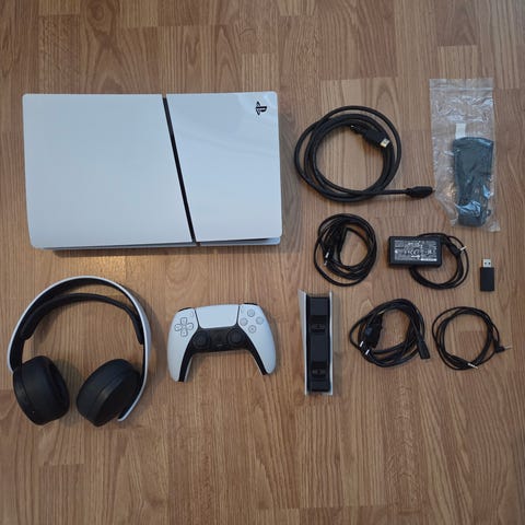PS5 Pro -konsoli, DualSense -ohjain, virtajohto, hdmi, USB-C latausjohto ohjaimelle.