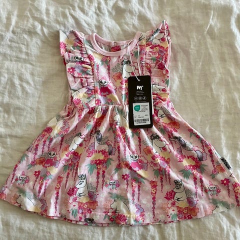 Muumikuvituksella olevat oloasu (koko 74) ja mekko (koko 86)