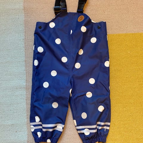 Hyvässä kunnossa olevat välikausihousut, koossa 80/86. Pieni valkoinen viiru vasemman lahkeen alaosassa, näkyy kuvassa. Ei kuitenkaan reikiä tms isompaa kulumaa. Materiaali kovin samankaltainen kun po.p kuorihousuissa. Hylkii siis kivasti vettä mutta en usko että lätäkössä istumista kestää😁
