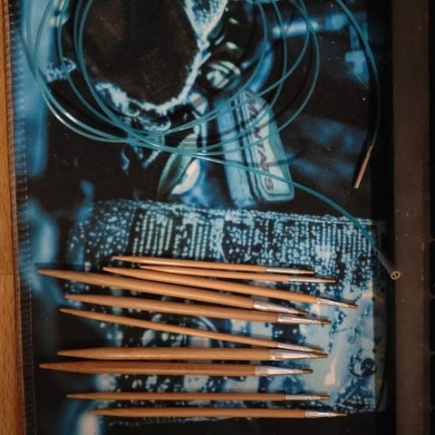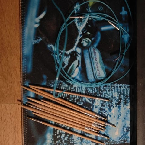Settiin kuuluu metalliset 2mm, 3mm, 4mm, 4,5mm ja 5mm puikot, lyhyemmät 2,75mm bambua ja 4 kaapelia, mini 60cm (2mm puikoille) ja 60cm, 100cm ja 130mm muille puikoille.