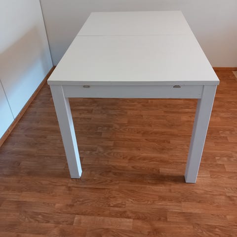 Meiltä saisi tulla hakemaan ruokapöydän. Pöydässä on paljon käytönjälkiä, mutta tuunaamalla varmasti vielä kelpo pöytä. En osaa sanoa mitä materiaalia, pinta ainakin maalattu. On aika painava joten veikkaisin kuitenkin täyspuuta. Mitat: 100cmx200cm + 2 irtonaista jatkopalaa 50cm kumpikin. Ostettu aikoinaan Kruunukalusteesta. Vain nouto ja vaikka heti.