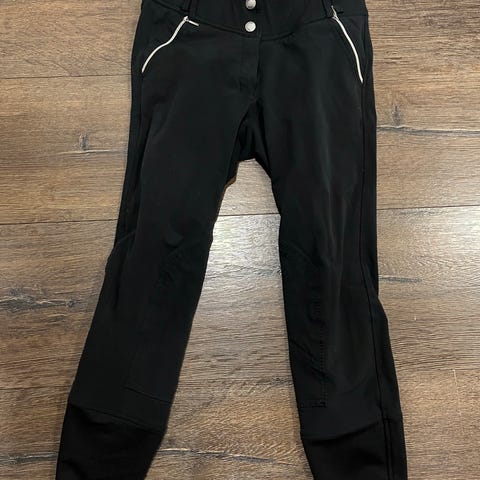 Pari kertaa käytetyt mustat ratsastustoppahousut, housissa lanteilla säätömahdollissuus, sekä gripit takana ja lahkeissa. Lahkeissa myös kokomatkalta heijastimet ja vetoketju n.20cm matkalla.