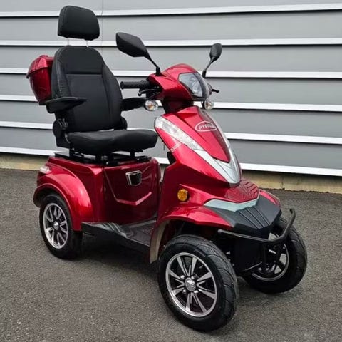 Pyrkijä nelipyöräinen, punainen sähköskootteri. Mallissa on neljä ilmakumi rengasta, korkea selkänojallinen istuin käsinojilla sekä jalkatuki tasaisella alustalla. Ohjaustangossa on digitaalinen näyttö, josta näkyvät nopeus, akun varaus ja ajokilometrit. Edessä on säilytyslaatikko ja takana kiinnike esimerkiksi kepille tai sateenvarjolle. Ajoneuvo soveltuu liikkumisen apuvälineeksi aikuisille käyttäjille ulko- ja sisäkäyttöön . Ostettu keväällä 23, ajettu kesä 23 jonka jälkeen seisonut lämpimässä varastossa. Kilometrit yhteensä 183, mukana laturi ja suojapeite.