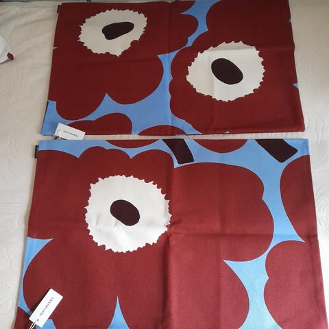 Marimekko tyynyliina / tyynynpäällinen vaalealla Unikko kuviollisella kankaalla. Koko 54 x 64 cm eli normaalia nukkumatyynyä hieman isompi. Meillä ollut käytössä ison petaustyynyn kanssa, ei nukkumiskäytössä. Kangas on tulevahkoa pellavasekoitetta eli laadukkaan oloinen. Tehdastekoinen. Ei vetoketjua.