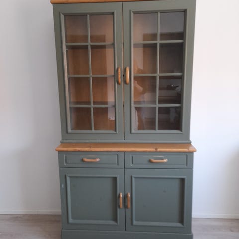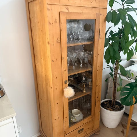 Selkeälinjainen vanha täyspuinen vitriinikaappi alalaatikoilla