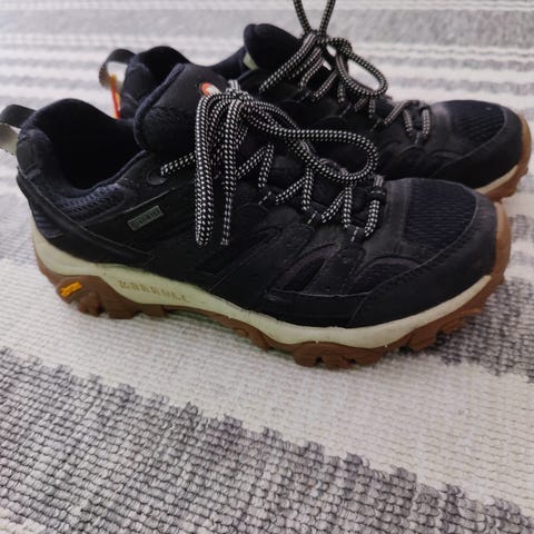 Erittäin hyväkuntoiset vain pari kertaa ulkona käytetyt vedenpitävät Merrell West Rim Sport GTX -kengät. Väri musta/turkoosi. Kengät ovat kevyet ja niiden pohja on pitävä ja hyvin vaimennettu. Päällisen materiaali keinonahka/ tekstiili.