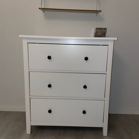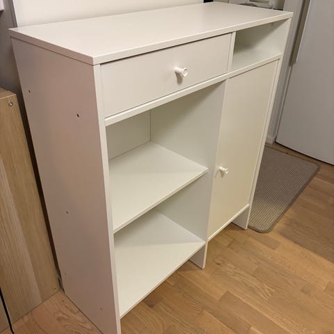 Valkoinen lipasto kaapeilla ja laatikoilla