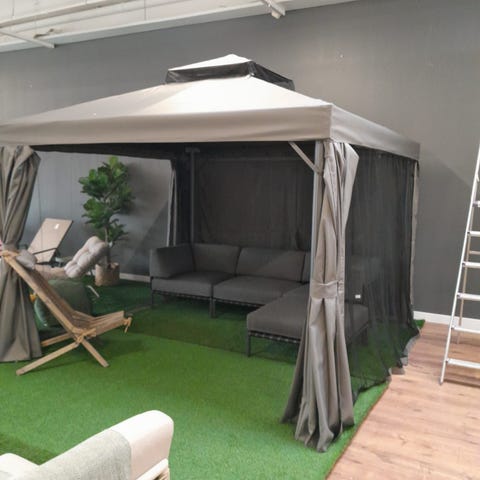 Maui paviljonki ulkokäyttöön. Mitat noin 2,95 x 3,95 m. Paviljongissa on kangaskatto ja verhot sivuilla, jotka voidaan sitoa auki tai sulkea. Runko on nelijalkainen ja suunniteltu puutarhaan tai terassille.