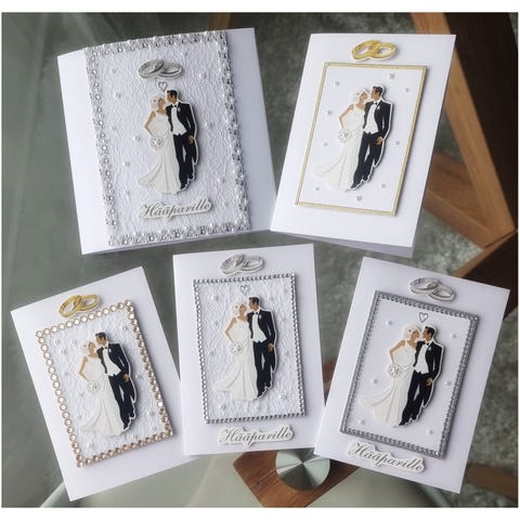 Itse suunniteltu ja koottu. Hääkortti, jonka etukannessa on hääparin kuva merimaisemassa. Kortissa on kohokuvioitu kehys ja koristeellinen teksti ”Hääparille”. Sisäpuoli on lähes tyhjä, vain kehys ja pieni koriste, joten omalle tervehdykselle jää hyvin tilaa. Sopii hääonnittelukortiksi. Kuvista päätellen saatavilla voi olla useita hieman erilaisia kansikuvavaihtoehtoja samalla teemalla.