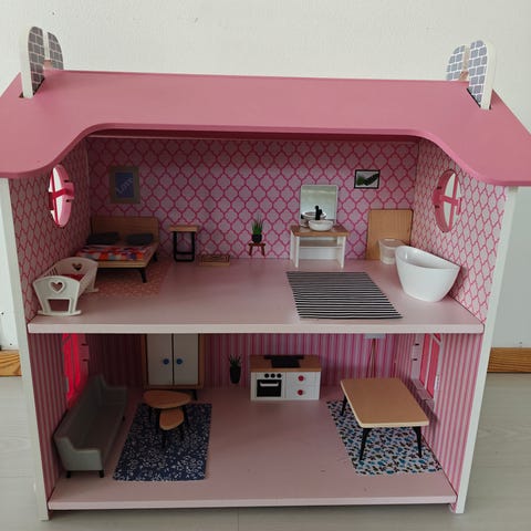 Nukkekoti. Käytön jälkiä näkyy.