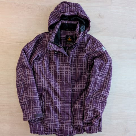 Myydään Icepeakin naisten hupullinen ulkoilutakki/tuulitakki, valkoinen vaaleanpunaisilla ja harmailla ruuduilla kuvioituna. Kaksi vetoketjullista taskua edessä, ja yksi pieni tasku takin sisäpuolella. Kiristettävä helma ja huppu. Huppu on irrotettavissa, siinä nappikiinnitys.