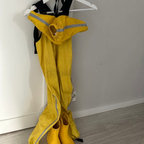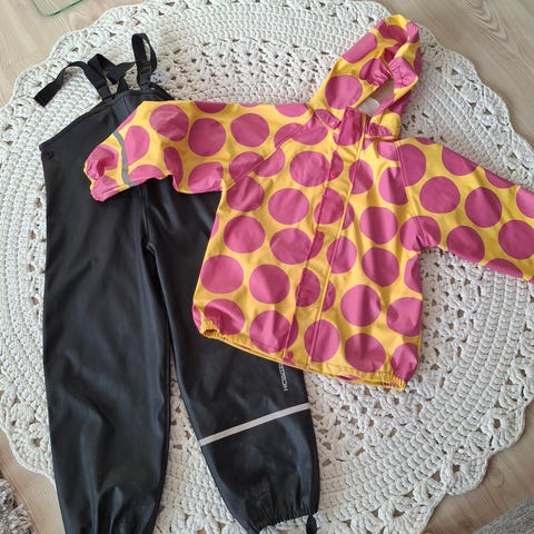 Fleece vuorelliset kuravaatteet, takki Lindex 128cm ja housut Lupilu 122/128cm, sopii mielestäni kummassakin koossa. Lahkeiden alaosassa sisäpuolella pelkkä vuori, eli fleece ei ihan alas asti.