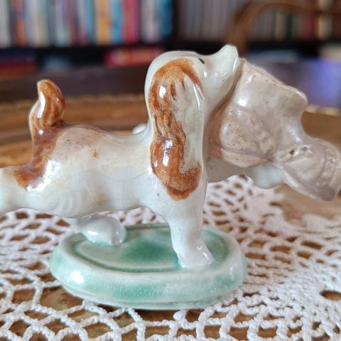 Pieni käsintehty spanjeli koira-aiheinen keramiikkapatsas. Patsas esittää istuvaa koiraa ja siinä on vaalea, ruskeasävyinen lasitus. Pohjassa on tekijän merkintä. Tekijä Svante Turunen