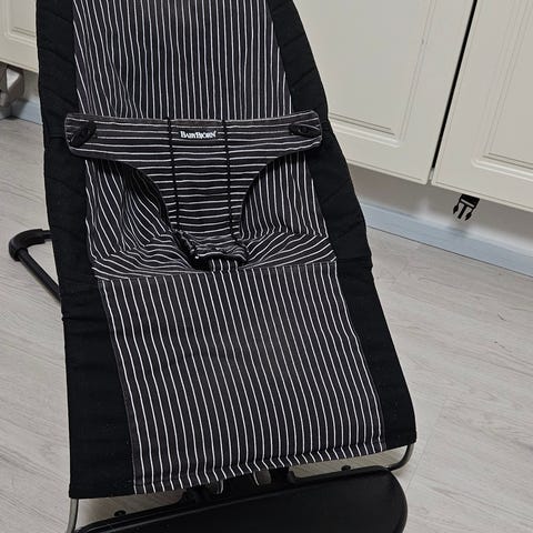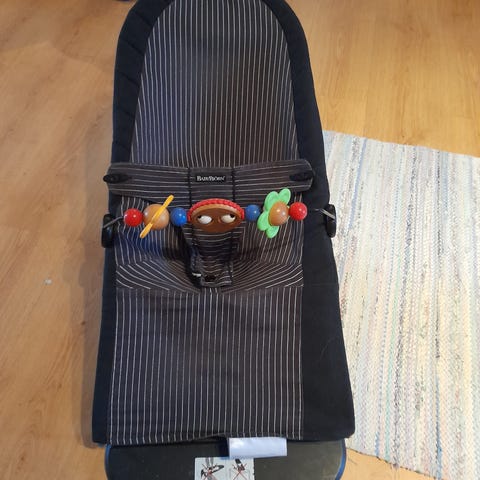 Babybjörn sitteri, jossa on metallinen runko ja teetetty kangaspäällinen, jossa on vihreäsävyinen kuviollinen istuinosa ja musta alaosa. Tuoliin on kiinnitetty irrotettava lelukaari värikkäillä leluilla. Selkänojan kallistusta voi säätää rungon mekanismilla. Tuoli soveltuu vauvalle rentoutumiseen ja leikkihetkiin.
