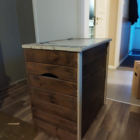 Mitat 63cm, leveys 71cm, syvyys 42cm. Pyörät alla ja kantokahvat sivuilla. Kansi ei mene täysin kiinni.