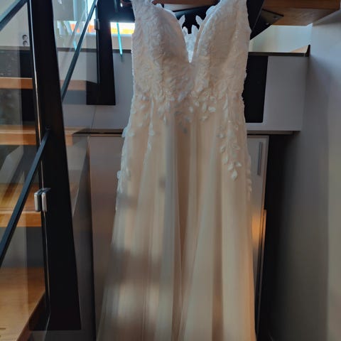 Käytettynä Porin Juhlavasta ostettu eli kahdet häät tanssittu kaunis hääpuku. Pesetetty pesulassa, mekko on virheetön ja siisti. Kaunis kukkapitsi ja lyhyt laahus.