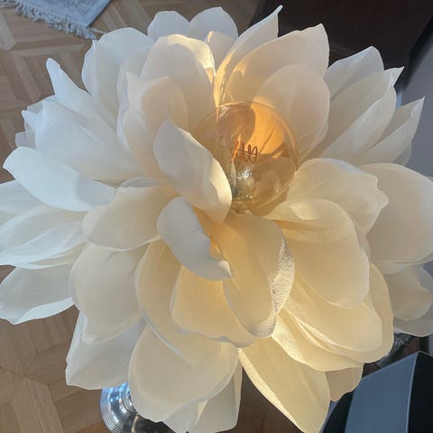 Uniikki ja kaunis kreppipaperivalaisin. Tehty käsityönä. Sopii parhaiten seinälle ripustettavaksi mutta voidaan käyttää myös kattovalaisimena. Mukaan tulee johto ja led hehku. Johdon pituus 3,5m.