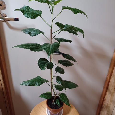 Myynnissä kiinanruusu, kerrottu punainen kukka, korkeus ilman ruukkua noin 135 cm.