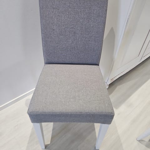 Valkoiset tuolit, joissa tummanharmaa istuinpehmuste ja puiset jalat.