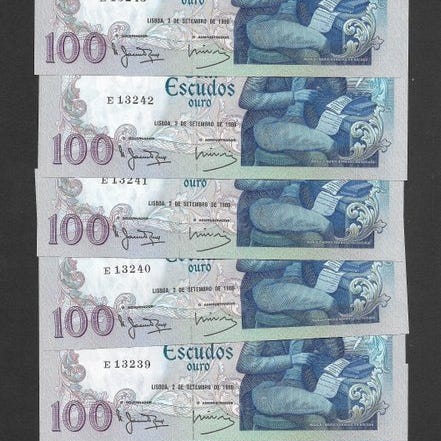 Portugali 100 escudoa metallinen juhlaraha vuodelta 1989. Toisella puolella teksti “República Portuguesa” ja nimellisarvo 100$00 sekä Portugalin vaakuna. Toisella puolella tekstit “Arquipélago dos Açores”, vuosiluvut 1439–1989 ja 1427–1452 sekä purjelaivan ja tähtien kuva-aihe. Halkaisija noin 3 cm (mittakuva). Sopii esimerkiksi keräilyyn tai numismatiikasta kiinnostuneelle. (Tarjoa)